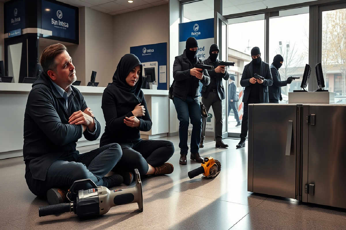 L’assalto è durato meno di venti minuti. Le immagini delle telecamere interne mostrano i rapinatori entrare con decisione e prendere subito il controllo della filiale. Dopo aver disattivato il sistema d’allarme – che, secondo i tecnici, era stato manomesso – hanno cercato di forzare la cassaforte con un flessibile nascosto in una borsa nera. Qualche minuto di scintille e colpi secchi. Uno dei banditi teneva sotto tiro i dipendenti legati a terra, mentre un altro frugava tra gli uffici.